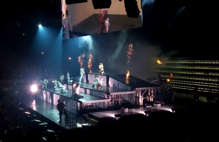 Y es que, si algo tuvo de bueno el show es que a nivel tecnológico todo era tremendamente alucinante, como las pasarelas flotantes por las que accedía a los pequeños escenarios situados en medio de la pista, que también formaban parte en otras ocasiones de las labores de iluminación. No hay que olvidar el escenario principal que, además de jugar con los efectos y las luces de manera apabullante, se caracterizaba por estar formado por varios bloques que se levantaban en forma de cubos, creando rampas, escaleras y demás, jugando así con una geometría que Gaga y sus bailarines aprovecharon de todas las maneras posibles.