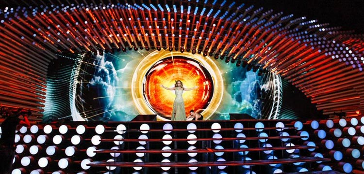 Actuaciones 20 mayo 2015Segundo ensayo de Edurne en el escenario de Eurovisión 2015 La cantante ha actuado con un nuevo vestido dorado.