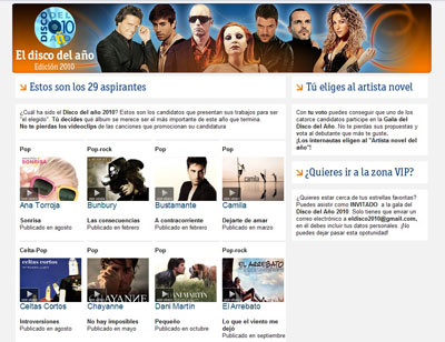 En el siguiente enlace puedes conocer el listado completo de discos seleccionados y también votar por el artísta novel: http://www.rtve.es/television/disco-ano-2010/
